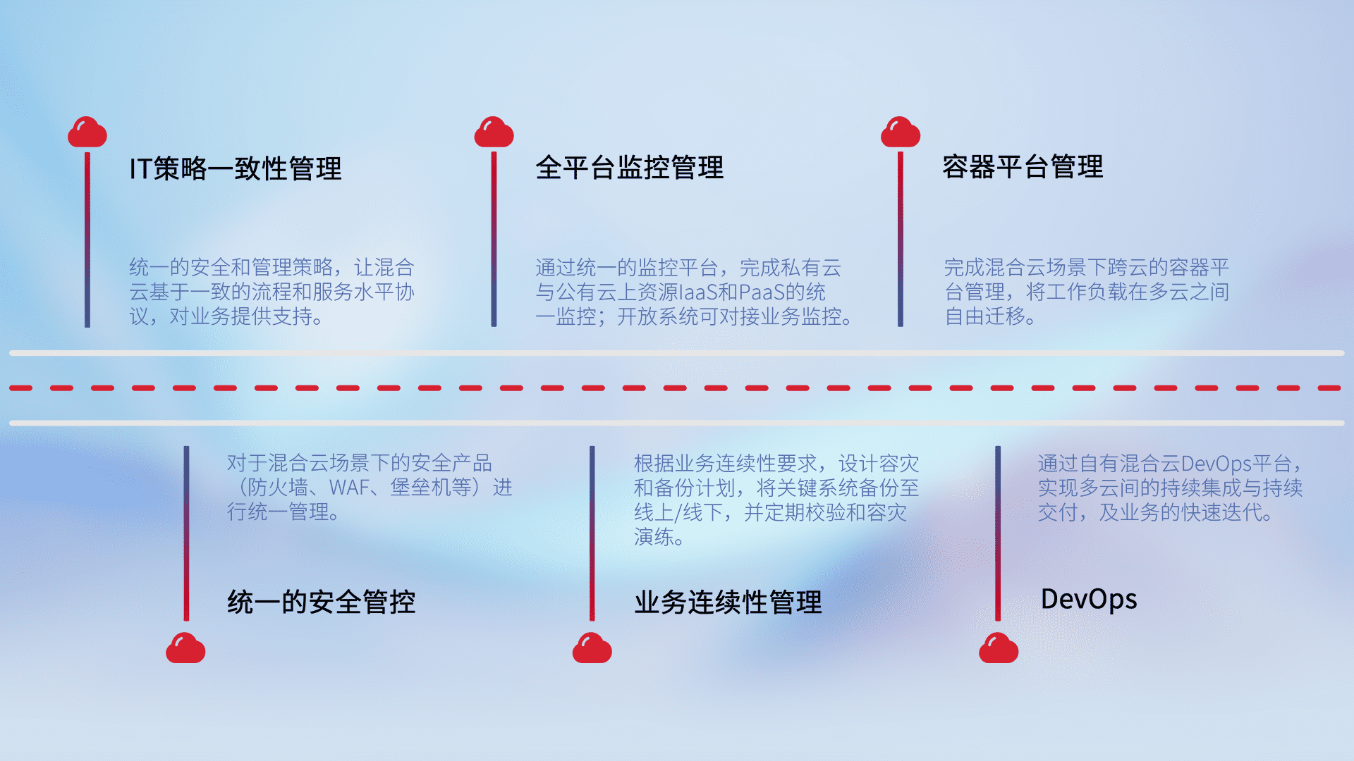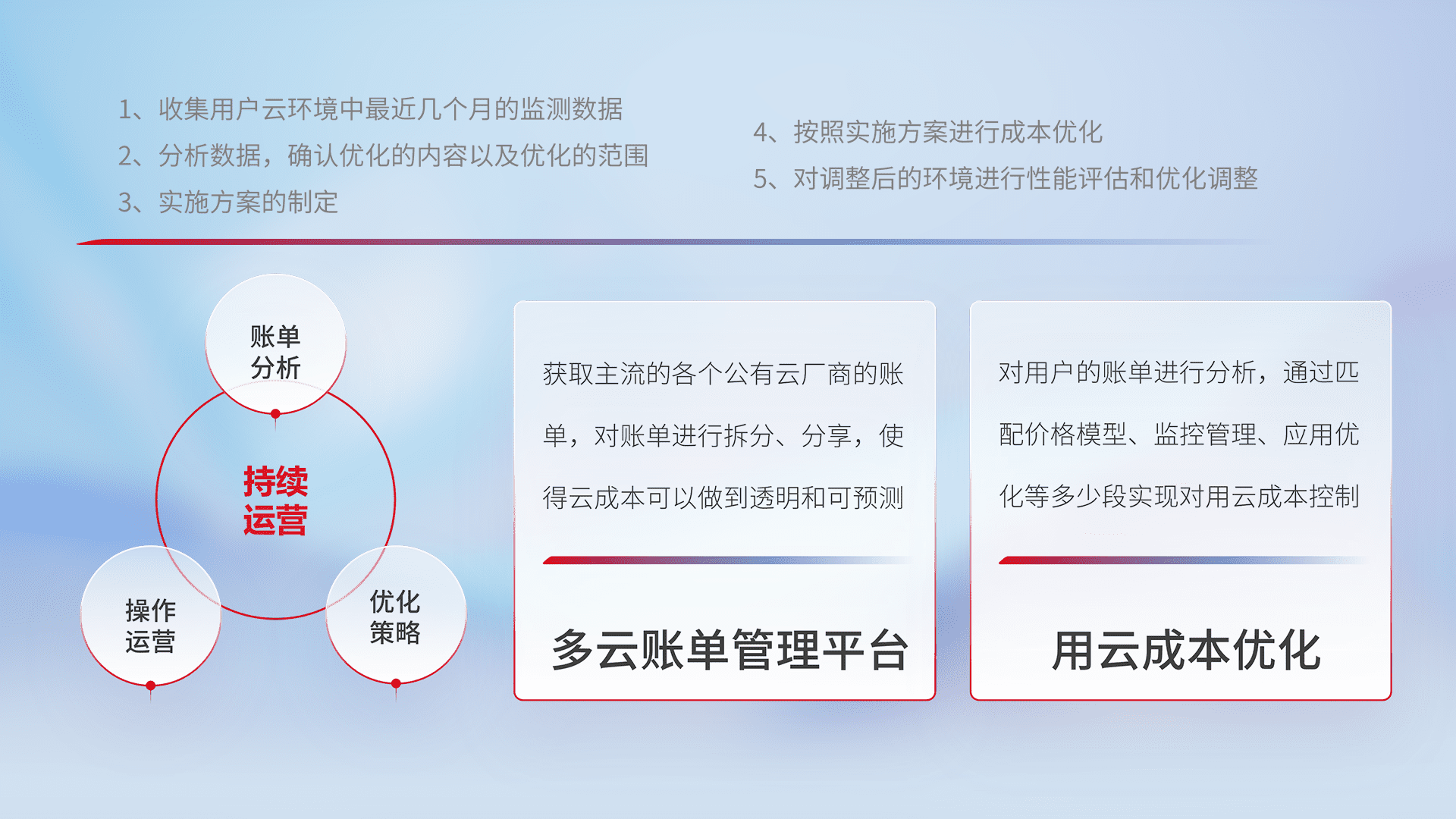 通过多云纳管,,,,以统一的资源数据模型把客户的云资源进行抽象和封装,,,进而实现对多云资源的统一操作,,保障云资源管理的可靠性、、稳定性与可用性。。。量身定制化运维内容,,配置、、、、开发运维、、补丁管理、、、、备份、、、监控、、、认证和访问管理、、、审计和日常巡检等,,保障在用云过程中的可靠度,,稳定度以及高可用率。。